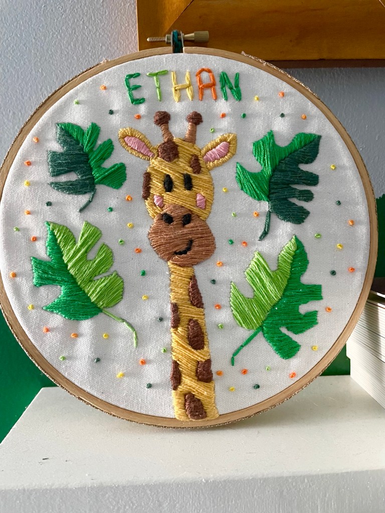 We love doing kids pieces! Do you have a little one in your life with a favorite animal? Inquire about custom kids’ room embroidery art.