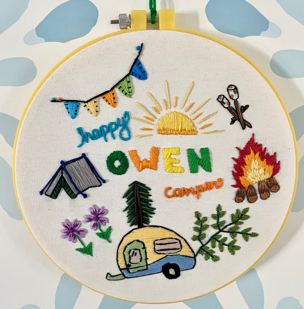 Happy Camper 0 June 28, 2024 Written by chelseasocha EXAMPLE: NOT FOR SALE. 8″ embroidery hoop A custom nursery piece for a camping-inspired little boy’s room. So fun to do! Share this: Share on X (Opens in new window) X Share on Facebook (Opens in new window) Facebook Like Loading... Related